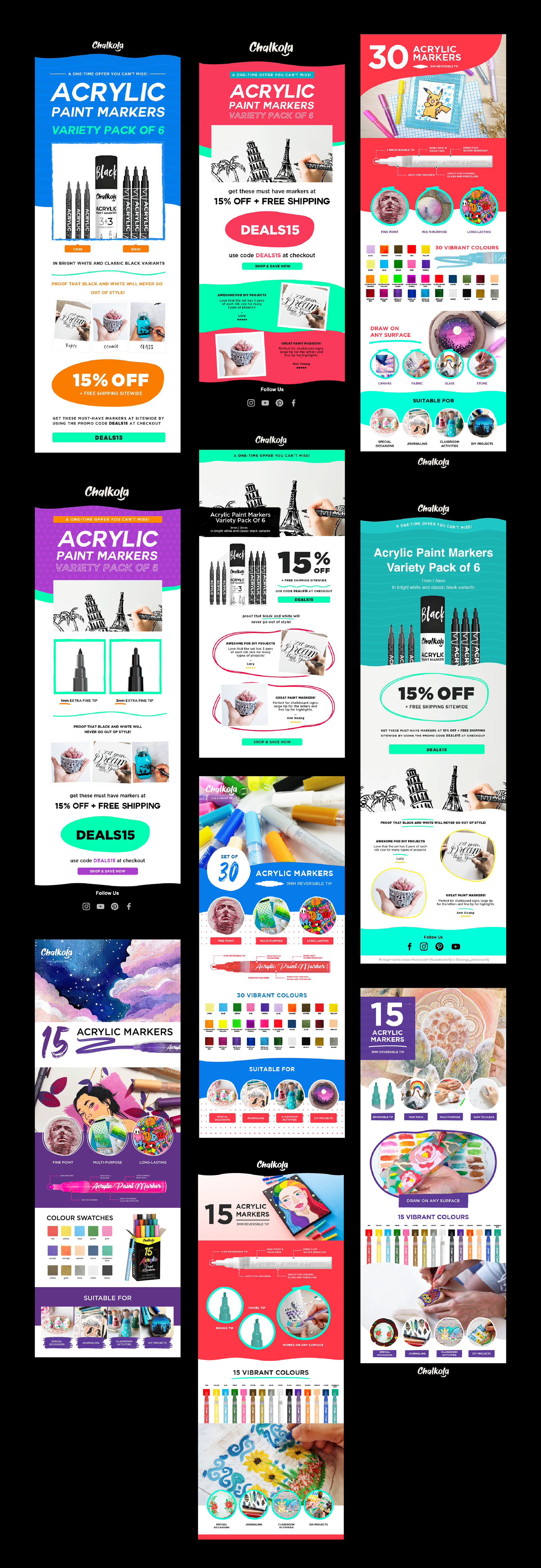 Collaborated with Chalkola, an Amazon-based stationery brand specializing in art supplies like markers and paints, to elevate their product marketing presence across digital platforms. The project involved end-to-end design support including video editing, EDM (Electronic Direct Mail) design, Enhanced Brand Content (EBC) for Amazon listings, product thumbnails, and social media assets.