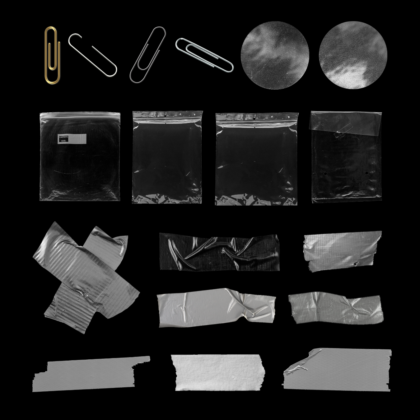 Hardware Texture Pack • 50 Vintage Paper, Metal & Utility Textures for Designers Give your projects an industrial, lived-in, scrapbook-ready feel with this Hardware Texture Pack featuring 50 high-resolution textures inspired by real clips, pockets, labels, duct tape, metal stickers, matte holographic scraps, and distressed paper. Perfect for scrapbooks, digital collages, grunge layouts, posters, zines, moodboards, and retro-inspired branding, these elements add instant realism with rough edges, scuffs, and natural wear. Every texture is scanned, cleaned, and exported as a transparent PNG so you can drag it straight into your design.