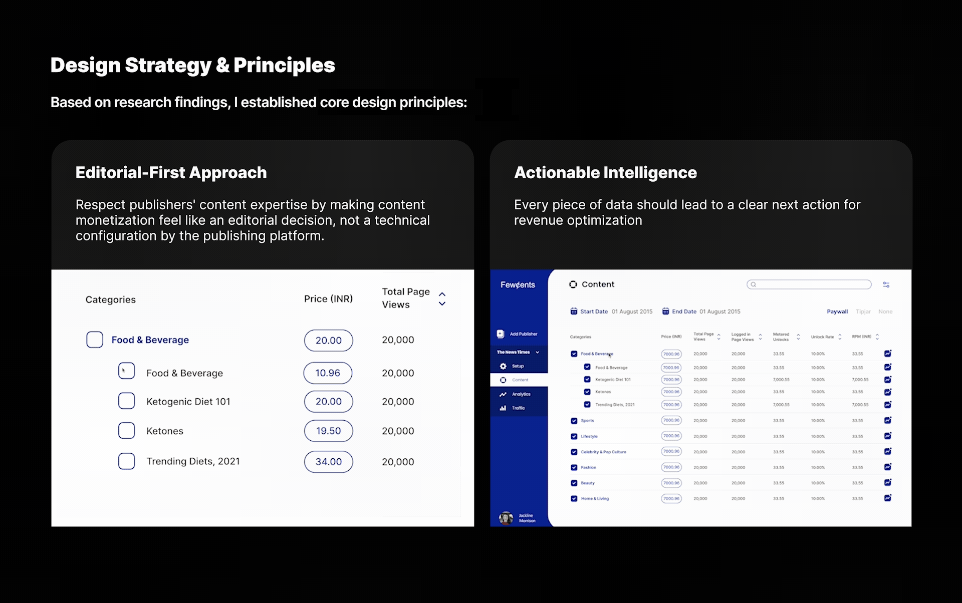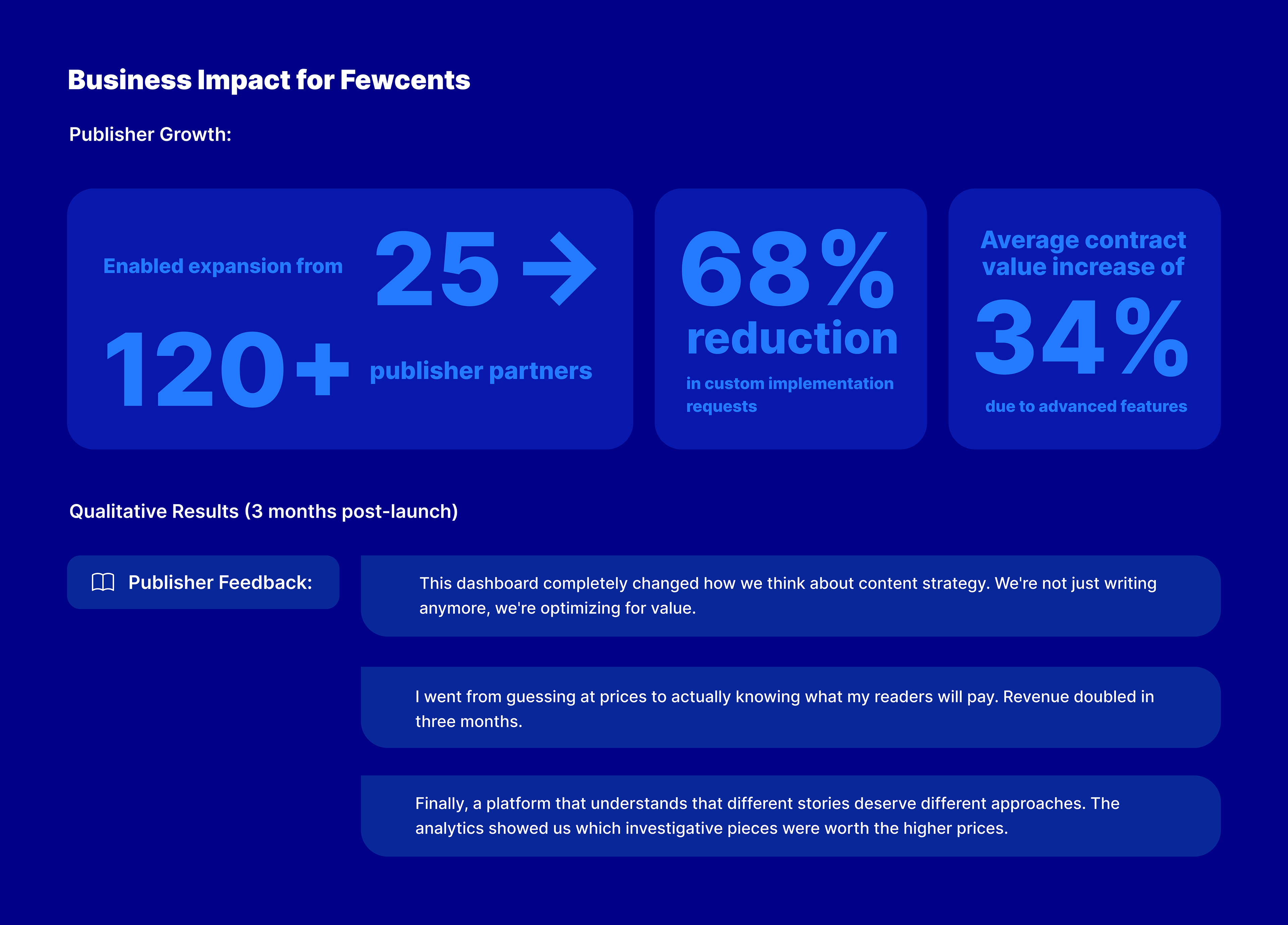 I designed the Fewcents Publisher Dashboard, giving publishers intuitive controls to set pricing, run A/B tests, and analyze content performance. By combining simple defaults with advanced features, the dashboard helped partners boost micropayment revenue by 47%, improve satisfaction (NPS 72), and scale Fewcents from a widget to a full content monetization platform.